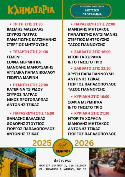 Η "Κληματαριά" αποτελεί ένα από τα πιο παραδοσιακά και αγαπημένα εστιατόρια ταβέρνες στην καρδιά της Αθήνας, συγκεκριμένα στην Ομόνοια. Με πάνω από 90 χρόνια ιστορίας στο κέντρο της Αθήνας, η "Κληματαριά" έχει κρατήσει ζωντανή την παράδοση και τις αυθεντικές γεύσεις που έχουν μεγαλώσει πολλές Αθηναϊκές οικογένειες. Η τοποθεσία της στο ιστορικό κέντρο της πόλης την καθιστά εύκολα προσβάσιμη για όλους τους κατοίκους της Αττικής αλλά και τους επισκέπτες.