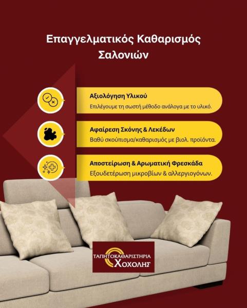 - Καθαρισμός σαλονιών: Με βιολογικό καθαρισμό και άριστα υλικά, τα σαλόνια σας θα λάμπουν σαν καινούργια.