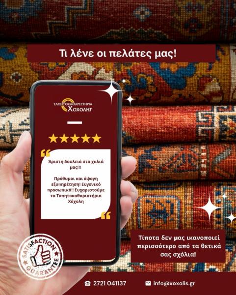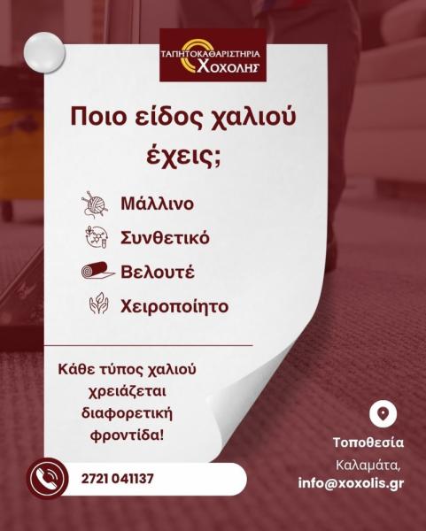 Μην διστάσετε να επικοινωνήσετε μαζί μας στο 2721041137 ή στο 6946057295 για να κλείσετε το ραντεβού σας. Εμπιστευτείτε την "Χόχολης" για την φροντίδα των χαλιών και των υφασμάτων σας και απολαύστε την αίσθηση της καθαριότητας και της φρεσκάδας στο σπίτι ή την επιχείρησή σας. Η ικανοποίησή σας είναι η προτεραιότητά μας και είμαστε εδώ για να σας εξυπηρετήσουμε με τον καλύτερο δυνατό τρόπο.
