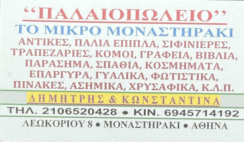 Εάν αναζητάτε έναν κρυμμένο θησαυρό ή επιθυμείτε να δώσετε νέα ζωή στον χώρο σας με μοναδικά κομμάτια, το "Καμπούρης Μικρό Μοναστηράκι" είναι ο προορισμός σας. Επισκεφθείτε το κατάστημά μας στο Μοναστηράκι και ανακαλύψτε την πλούσια συλλογή μας. Είμαστε εδώ για να σας βοηθήσουμε να εκτιμήσετε τα αντικείμενά σας και να βρείτε το τέλειο κομμάτι για το σπίτι σας. Ελάτε να γνωριστούμε και να μοιραστούμε μαζί σας την αγάπη μας για την τέχνη της παλαιότητας.